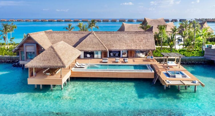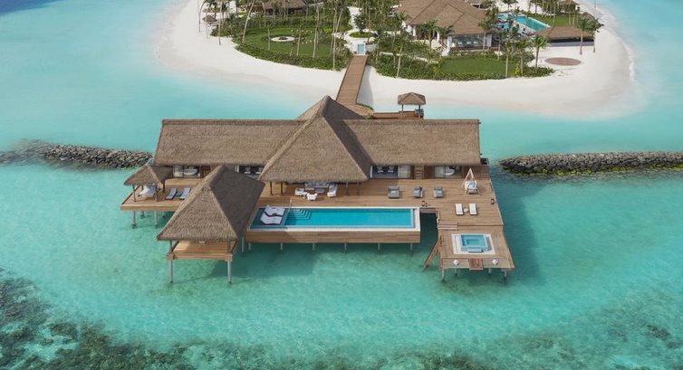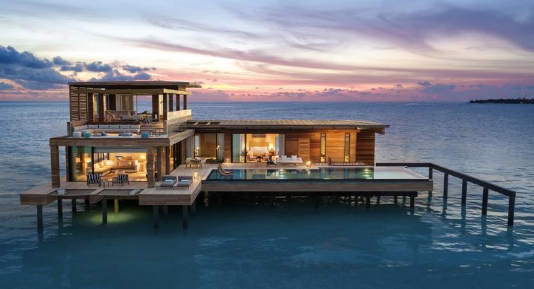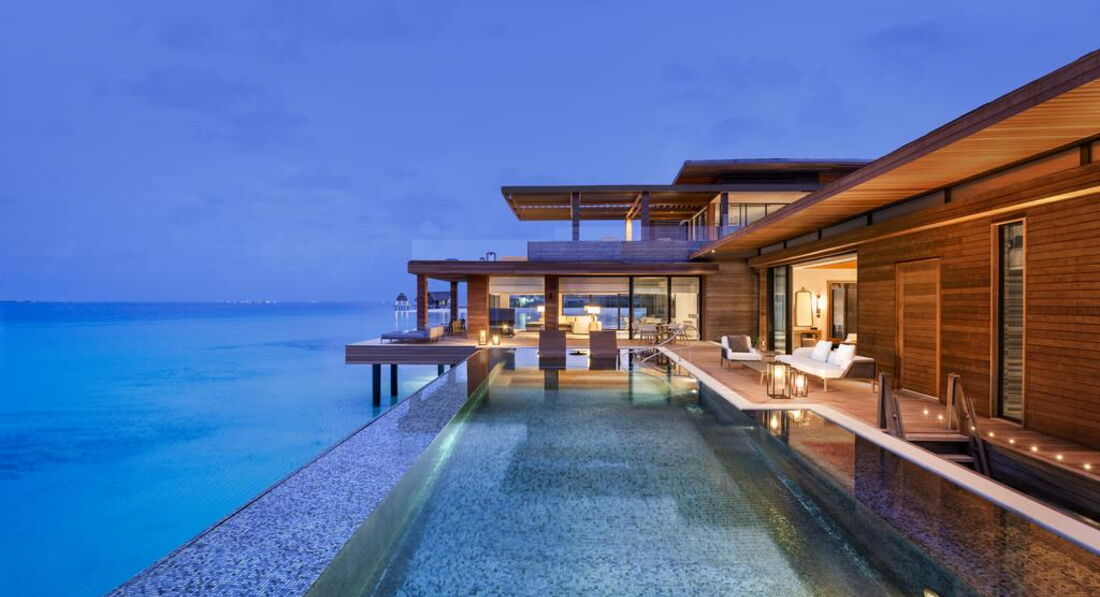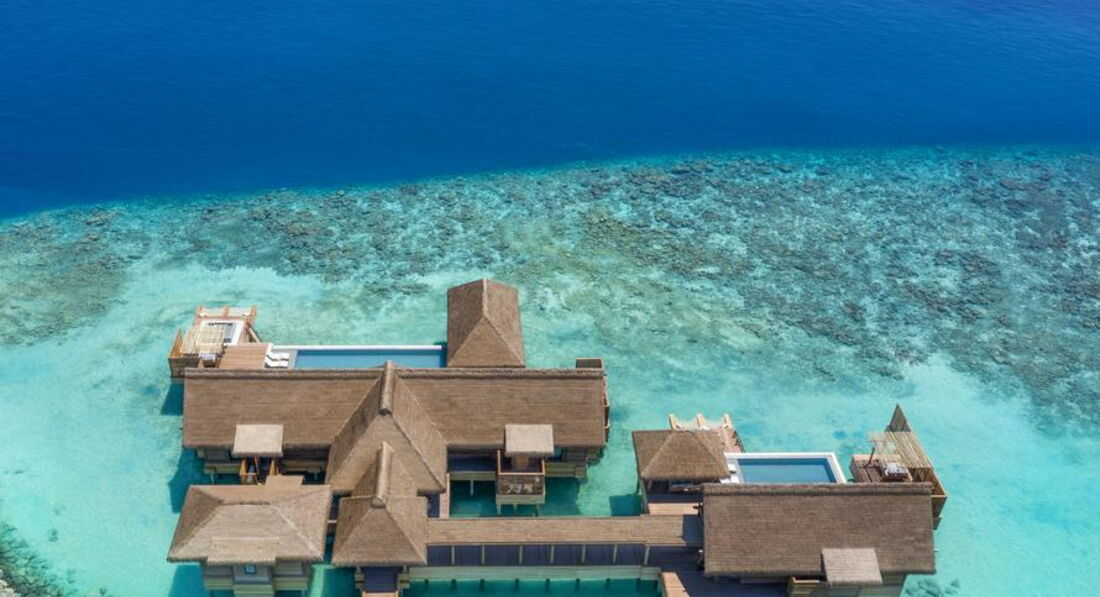 • 1 3 Bedroom Overwater Villa with Pool (1113 м2; макс. 8 чол.). Водна вілла з трьома спальнями (дві з ліжками king-size; одна – з окремими twin/ третя спальня розташована окремо від усього комплексу), вітальнею, обідньою зоною, невеликою кухнею. Тераса з обідньою зоною та зоною для відпочинку, два приватні басейни, надводний гамак, прямий спуск до рифу