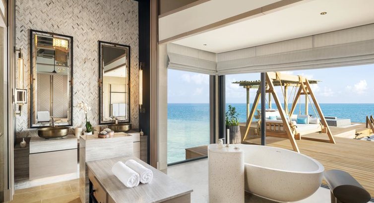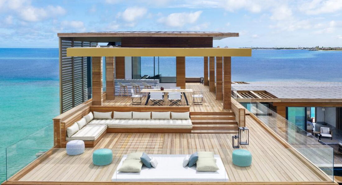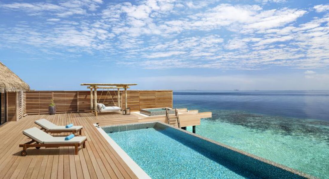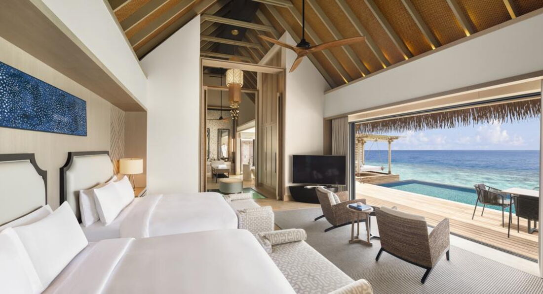 • 4 2 Bedroom Overwater Villa with Pool (624 м2; макс. 5 чол.). Водні вілли з прямим доступом до домашнього рифу. Дві спальні (одна з ліжком king-size; інша – з роздільними twin), вітальня, ванна кімната. Тераса з приватним басейном (15 х 4 м), обідній павільйон, диван-гойдалка, прямий спуск у воду