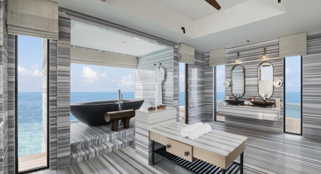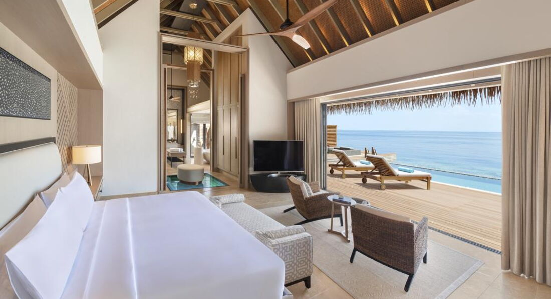 • 24 Grand Overwater Villa with Pool (334-346 м2; макс. 3 чол.). Водяні вілли. Спальня з ліжком king-size (2 номери мають окремі ліжка twin), вбиральня, вітальня, ванна кімната з ванною та душем, душ на відкритому повітрі. Тераса з приватним басейном (12 х 4 м) та зона відпочинку, надводний гамак