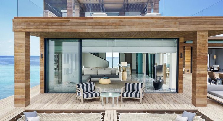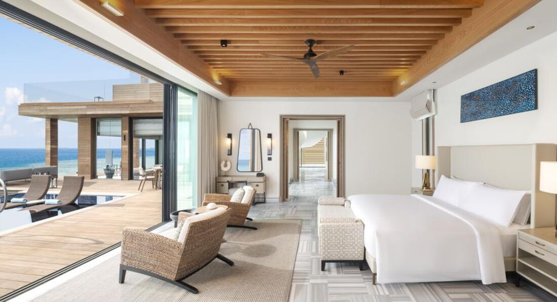 • 2 2 Bedroom Reef Villa with Pool (601 м2; макс. 5 чол.). Розташоване частково на воді, частково на березі. Дві спальні (одна з ліжком king-size/ інша, з окремими twin, розташована окремо від головної), вітальня, ванна кімната. Дворівнева тераса з приватним басейном (15 х 4 м), обідній павільйон, диван-гойдалка, надводний гамак, прямий спуск у воду