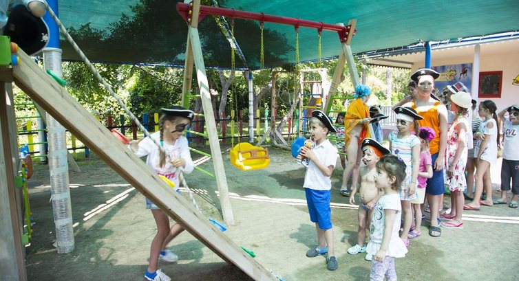 Отель на 5* не тянет. Приехали ночью, практически сразу разместили, детская кроватка в номере нас уже ждала. Обслуживающий персонал приветливый, но насчет уборки в номере надо тоже подстраиваться под уборщиков т.к. один раз у нас не убрались. Детская площадка не плохая: на ней 2 горки, качели, что-то типо скалодрома детского, детская площадка не под солнцем, а в тенёчке ( это очень хорошо). Детский бассейн есть, но в нем ничего нет. В отеле много детей и в ресторане постоянно слышится детский плач. Пожелания: - на дверь в номере повесить цепочку т.к. ее с внутренней стороны элементарно открыть и маленький ребенок ( 1,9 ) все время пытался открыть дверь и выбежать в коридор; - продлять номера с маленькими детьми или предусмотреть хоть комнатку мать и дитя, а то пришлось 7 часов жить на улице с маленьким ребенком...толком не умыть, не помыть, даже переодеваться пришлось в туалете. - каша геркулесовая в столовой плохая..с каким то мусором ( ребенок давился и плевался ей), детского меню не было. - прутья на балконе довольно далеко расположены друг от друга... приходилось очень тщательно следить, чтобы ребенок не подходил к ним. - лежаки расположены далеко от моря. - анимация слабая