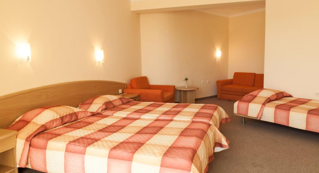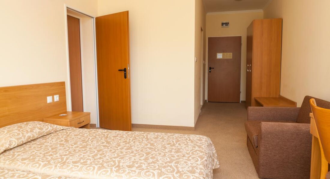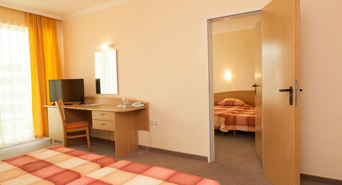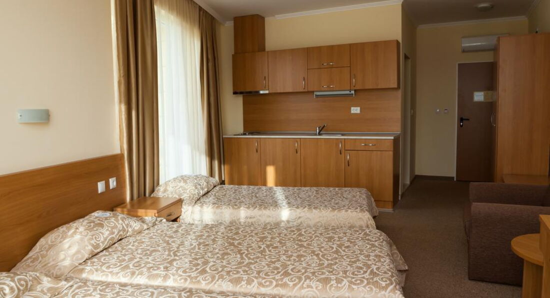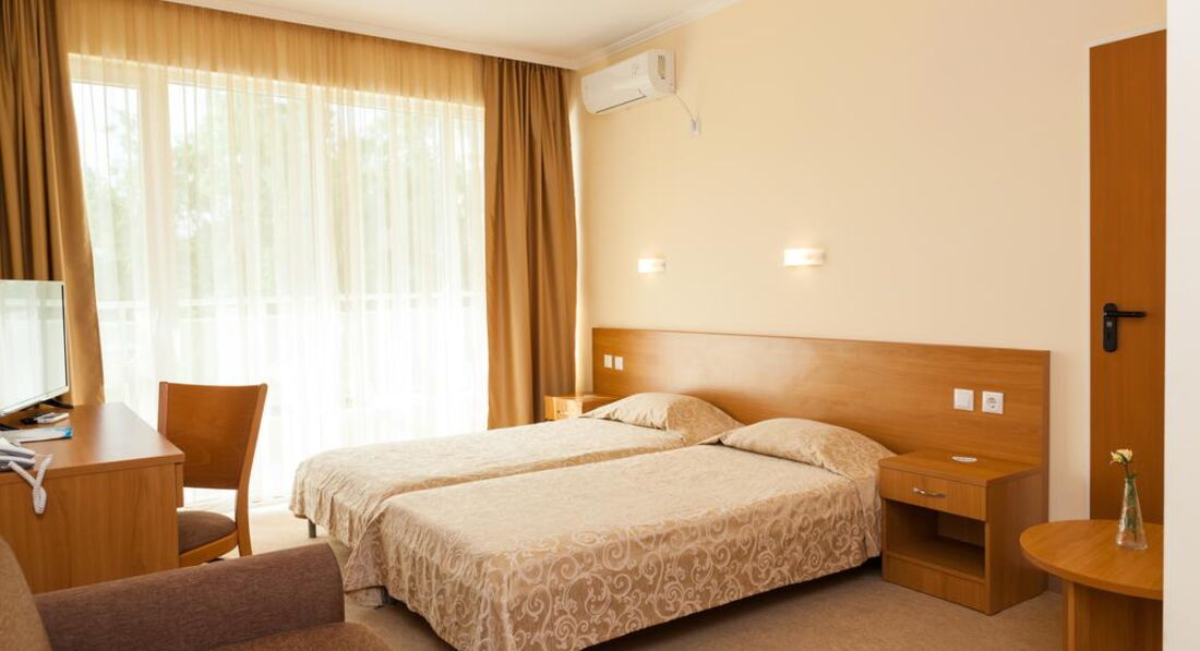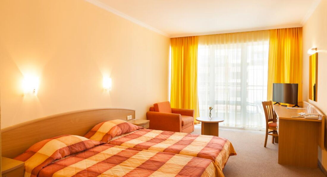 Номер стандартный в светло-желтых тонах , мебель новая,чистая , большая кровать, стол, стул , кухня, телевизор, кресло, шкаф, зеркало, кондиционер. На балконе столик со стульями, сушилка. В ванной комнате унитаз, раковина , зеркало, фен, душевая кабина. У нас протекал душ(лейка) , сообщили на ресепшене, через 10 минут лейку заменили. Убирались каждый день, полотенца(выдают по 3 на человека) меняют только , когда бросаешь на пол. Анимация хорошая, шумновато вечером, кто с маленькими детьми. Отель интернациональный , кого только нет(англичане, немцы, итальянцы, чехи, румыны, русские, украинцы, словаки,болгары). У отеля хорошее расположение, очень много магазинов,дискотека, казино, рядом остановка, можно доехать до Несебра (1,3 лева с человека) или до Святого Власа. В общем отдыхом остались довольны, персонал приветливый, отзывчивый, очень симпатичный отель. Прекрасный отель и если снова поедем в Болгарию , то только в этот отель!!!!!