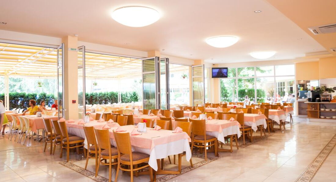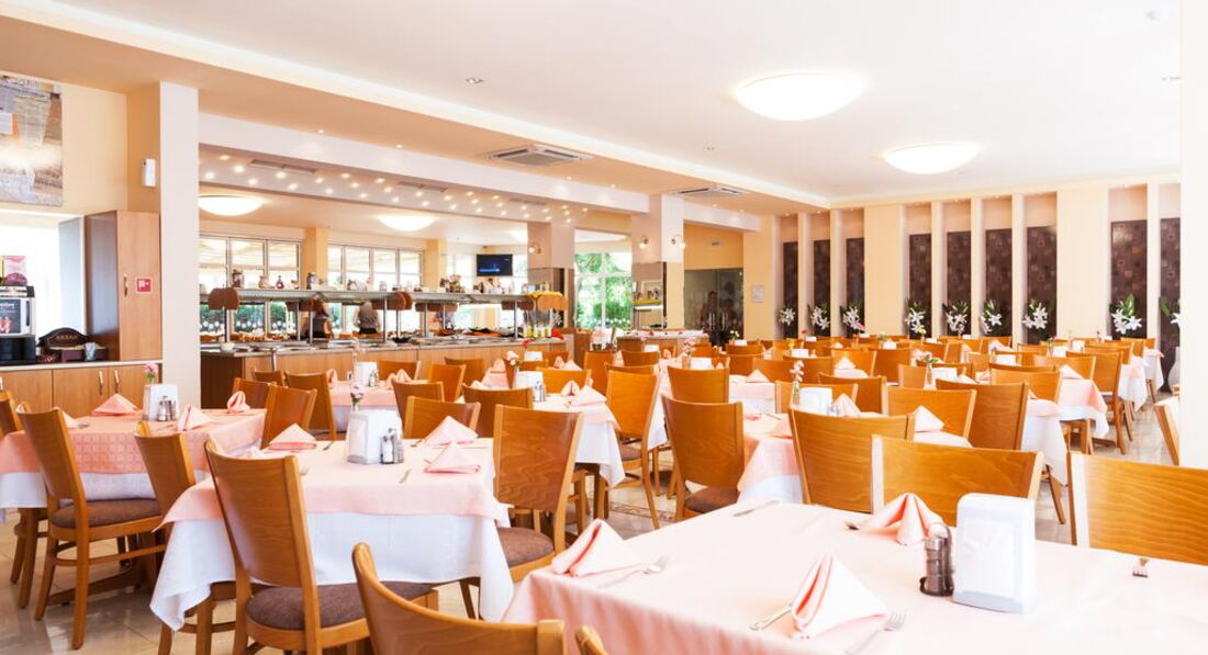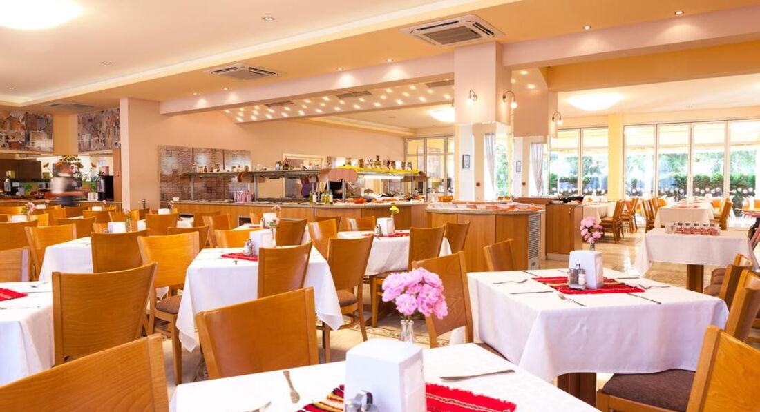 Что касается питания, я заметила, что начиная с третей недели июня питание стало разнообразней. На территории 2 ресторана. В одном завтрак, обед и ужин + открытая терраса с show cooking. И второй ресторан, где подается поздний завтрак и перекус. Вот во втором ресторане сначала были только 2 вида печенья, а с третей недели уже и выпечка, которая осталась с завтрака с основного ресторана, пирожные. А так же каждый день пицца, спагетти, картошка фри, помидоры, огурцы, соусы. Что касается основного ресторана хочется отметить, что было очень много мяса и разного. Много овощных блюд: овощи печенные в салате, просто отварные,рагу, сырые салаты и все разные. Овощи были все какие могут быть. На открытой террасе утром делали блинчики, яйца и что-то из мяса. В обед и ужин тоже мясное и рыбное. Каждый день были картошка фри, макароны, рис. Картофель отварной иногда с мясом, иногда с сосисками, иногда просто... Один раз было картофельное пюре. Единственное что не очень понравилось, это то что если на обед давали тушенные овощи какие-то в подливке, то на ужин эти овощи уже были с добавлением какого-нибудь мяса. Мало фруктов. Были бананы, грейпфруты, апельсины и яблоки. Несколько раз сверху на яблоки положили черешню. Сказать, что она была- трудно, но сказать что она не была- нельзя. Сезонных фруктов не было. (мы шли в магазин и покупали там. Совсем не дорого. Черешня, абрикосы, малина, клубника, персики - от 2,5 лева до 4,5 лева за кг) Мало десертов и выпечки. Выпечка была только на завтрак. Из десертов на обед и ужин были пирожные-бисквиты с кремом и торт. Получается разные виды (залитые розовым желе, шоколадным), но вкус одинаковый. Торт такой же как и пирожные, просто с орешками. Не мешало бы разнообразить. Каш вообще нет никаких. Маленького ребенка иногда накормить было тяжело.
