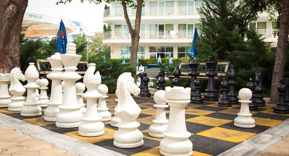 Бассейн не очень большой, но нам понравился. Вокруг бассейна негладкая плитка, это удобно, можно не бояться подскользнуться. Бассейн кстати с МИНЕРАЛЬНОЙ водой. Очень чистый. Да и вся территория очень чистая и красивая. Много зелени и цветов. Территория небольшая, но на ней уместилось много всего. Есть детская площадка, большие уличные шахматы, два стола для пинг-понга, дорожки для гольфа, бильярд(3 лева), аэрохоккей(3лева), волейбольная/футбольная площадка.