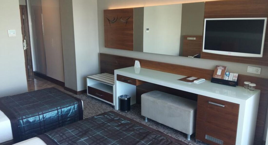 Заселение и номер. Приехали в отель в 11.15 утра, попросили подождать минут 30 пока уберут номер. Заселили в номер на 1 этаже, мы попросили сразу посмотреть, и из-за того, что вид из номера выходил прямо на стройку попросили что-нибудь другое. В результате нам достался номер на 5 этаже (5002), вид из номера классный - слева горы, прямо море, отель "Сириус делюкс". Номер отличный, все новое - и мебель и сантехника. Правда на 2 день что-то перестал работать кондиционер, вызвали персонал, все оперативно устранили. Убирали нормально, но периодически забывали ставить воду питьевую, но это не проблема, ее везде хватало в барах и можно было брать с собой.