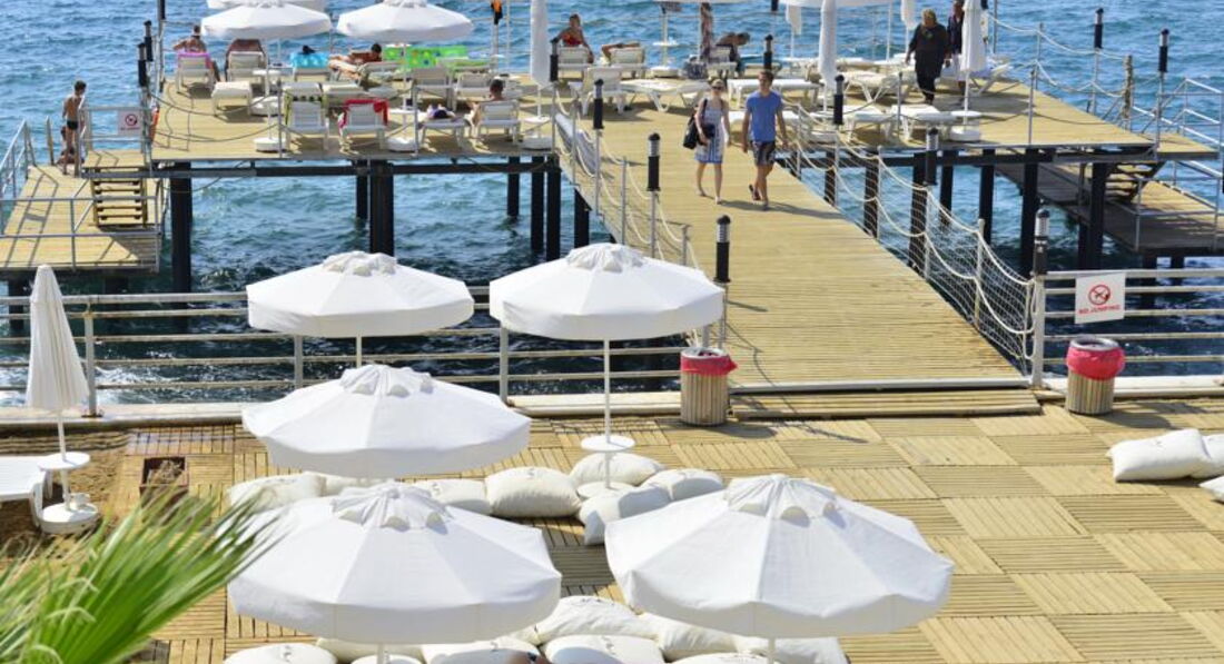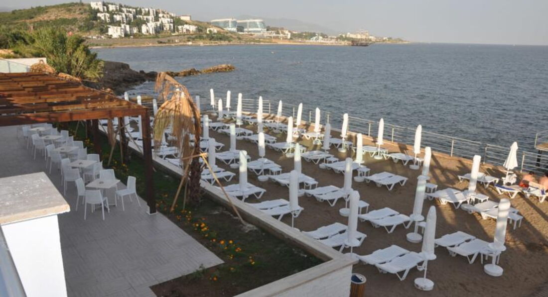 Погода все 2 недели была отличная. Пляж как и все уже описывали: выход в море с пирса, есть песчаный небольшой пляж. На песчаном пляже в основном отдыхали семьи с детьми. Вначале отдыха людей было немного на пляже, но к концу народу уже прибыло, и кто приходил попозже в часиков 10-11 утра лежаков уже могло и не хватить. На пляже убираю все чисто, хорошо, как и по всей территории. Пляжные полотенца выдают по карточке, но только 1 раз в день. Мы как-то поехали в Конаклы и сдали полотенца перед обедом, по приезду пошли на пляж и 2 раз нам не захотели выдавать.