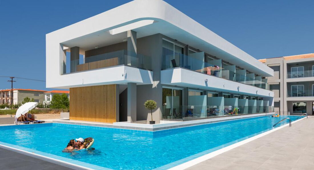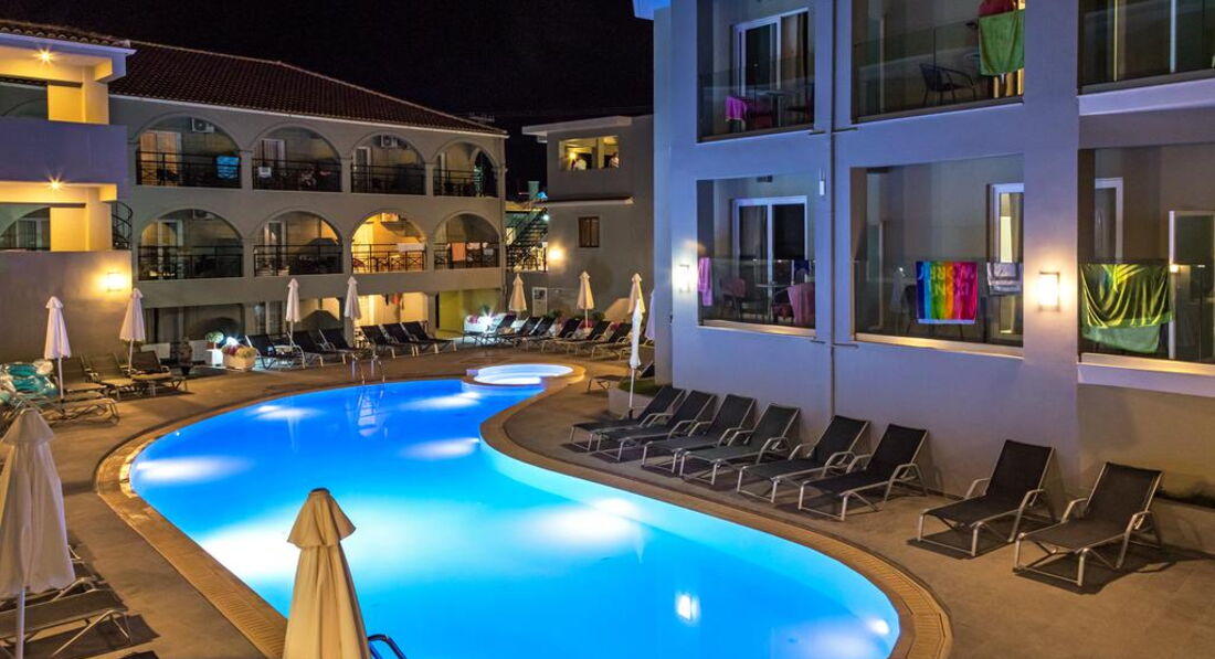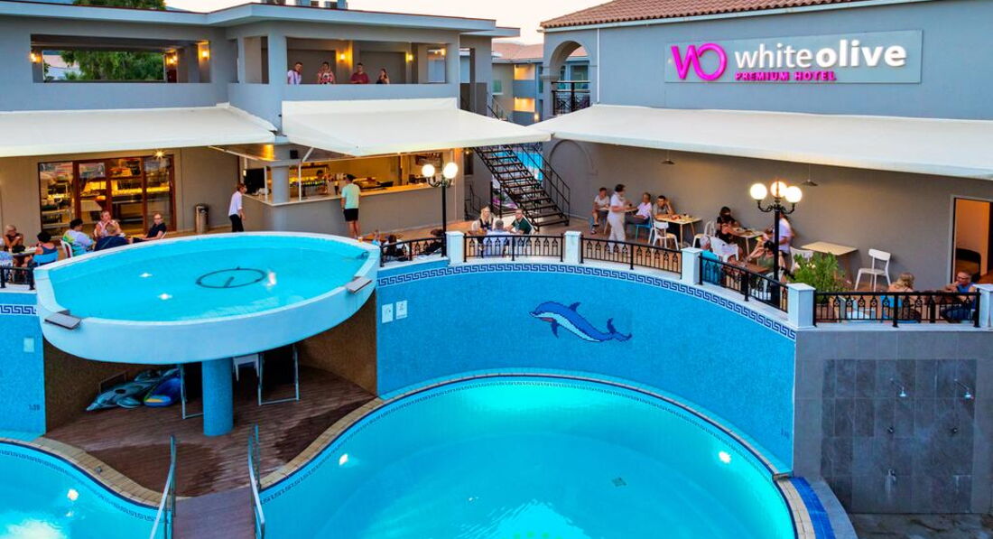 Готель White Olive Premium Laganas розташований на острові Закінф на курорті Лаганас, за 100 м від пляжу, за 800 м від центру міста. Готель повністю оновлений в 2018 р. Візантійський музей знаходиться в 7,5 км, Аргассі в 8 км від готелю. Підходить для сімейного відпочинку.