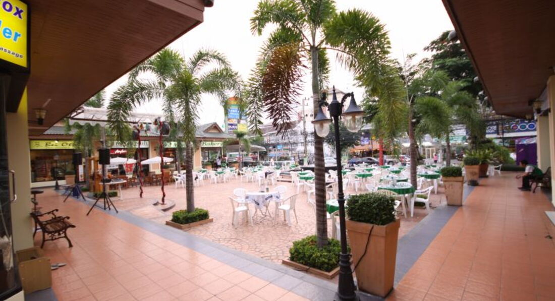 За зданием агентства есть площадка, там вечером от отеля кафе и живая музыка, там же аптека с русскоговорящим персоналом продукция с маслом ананаса хорошая, остальное можно найти дешевле в FESTIVAL на -1 этаже , там где вход в продуктовый отдел и в BEST на кассе и в зале . "Дельфины" рядом, транспорт во все стороны. До центра гораздо ближе, чем с юга Паттайи.