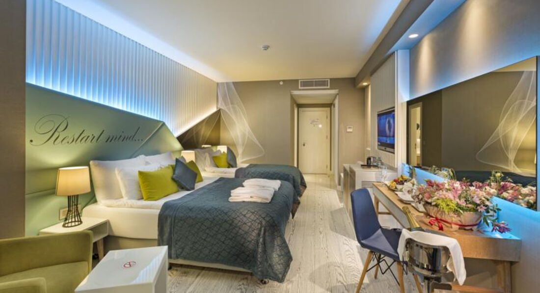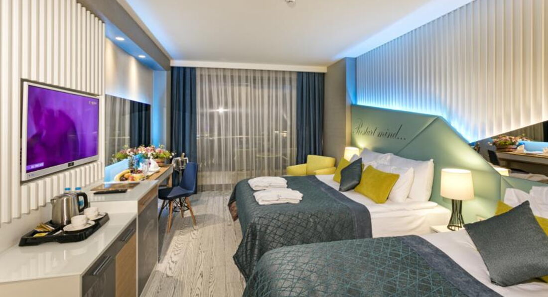 двухкомнатных.У отеля номера с видом на бассейн и с видом на не красивую часть города с речкой,похожей на большую канаву.Всех,кто с нами прилетел с поселением в де-люкс,поселили в номера с видом на эту улицу,хотя отель был полупустой и де-люкс предполагает улучшенный вид из окна.Мы покупали тур у БГ, может у них что-то напутано на сайте.Это был единственный минус в отеле.Нам понравилось все,хотя персонал не говорил на русском,всегда все было понятно, даже с минимальным английским.В ресторане обслуживали отлично,никогда ничего не кончалось,большой выбор блюд.Официанту сказали один раз,что на завтрак хотим айран и он приносил его сразу как только мы приходили ,всегда с улыбкой,было очень приятно находиться в ресторане.Первые три дня шел дождь и мы прекрасно проводили время в сауне,бане и бассейне.У бассейна одна стена и крыша из стекла с видом на открытый бассейн и когда на улице была стихия,ветром клонило пальмы,хлестал сильный дождь,было классно сидеть в горяченьком бассейне с гидромассажем и смотреть на улицу,вечером еще , включают подсветку,просто супер! В номере тоже все классно! Все новое и белоснежное ,полотенца меняли каждый день,хотя не было необходимости,меняли даже если не пользовались,ведь мы ходили в СПА. Очень удобные кровати , я забыла о бессоннице и отоспалась.В общем мы очень классно отдохнули и душой и телом,жалею,что не взяла ребенка,там есть прекрасно оборудованная комната для детей.На пляж отеля идти через дорогу минут пять,пляж прекрасно оборудован,отличный вход,песок.