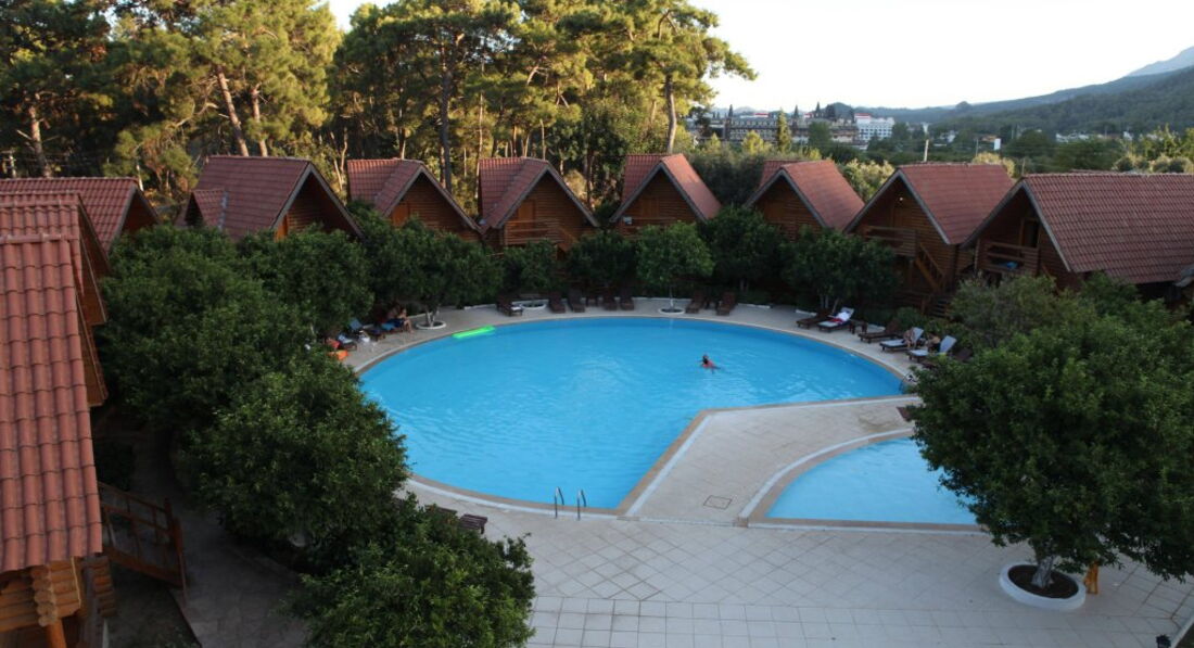 бунгало - двоповерхові дерев'яні будиночки, розташовані поруч один з одним, утворюючи півколо, всередині якого знаходиться невеликий басейн