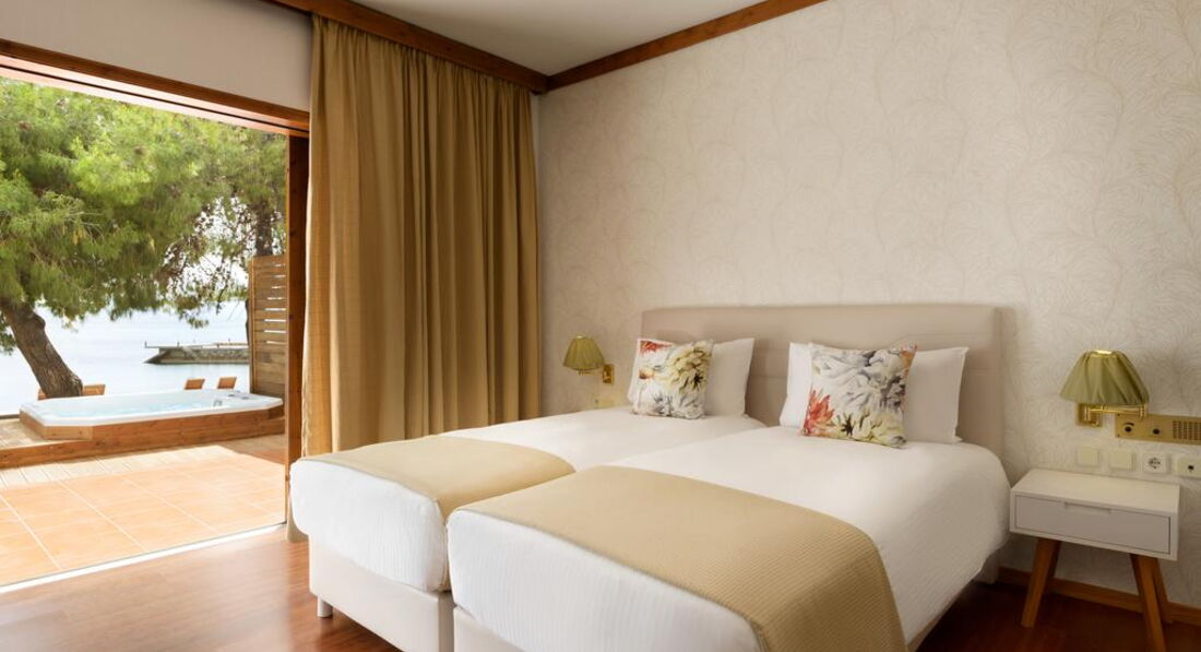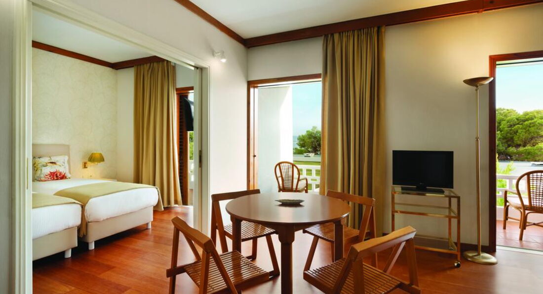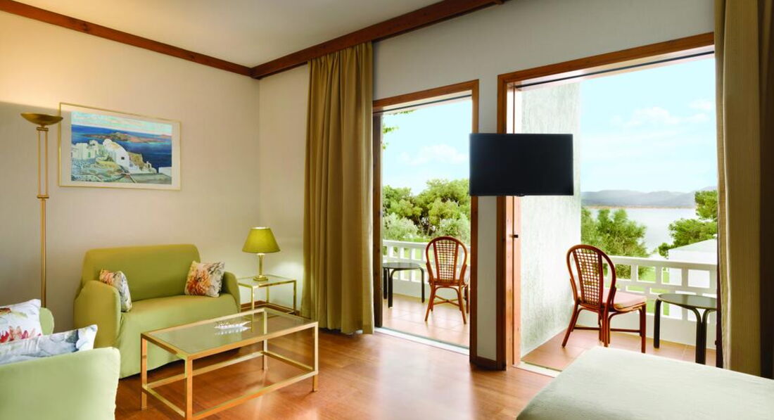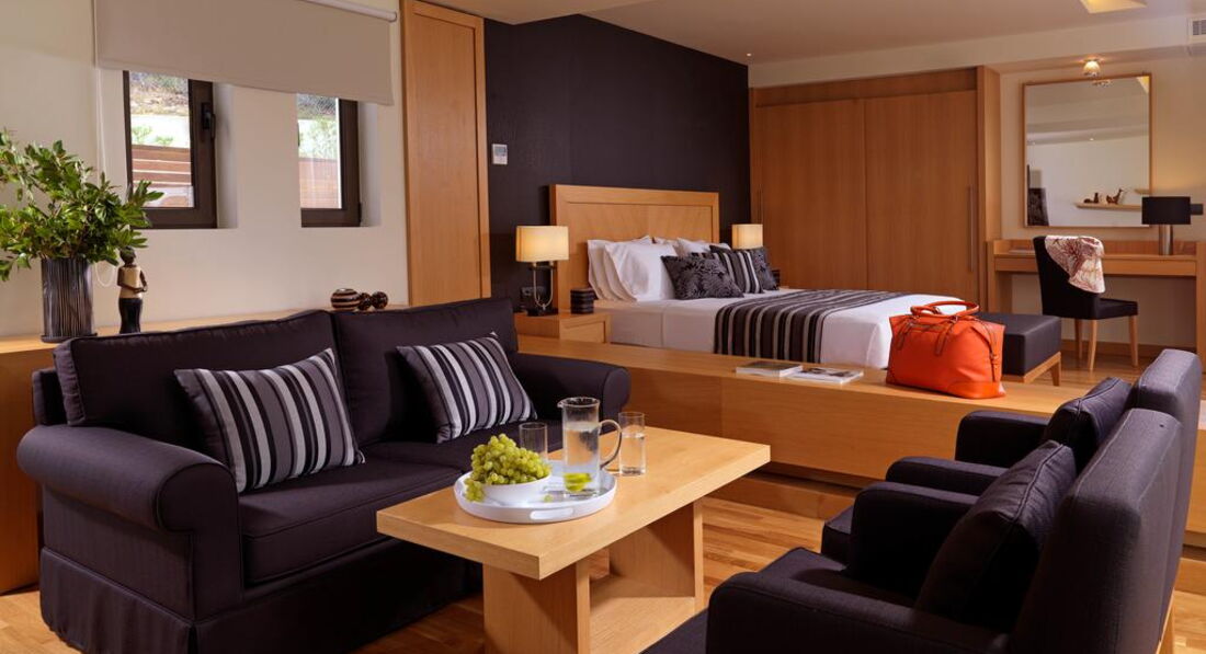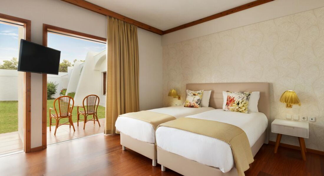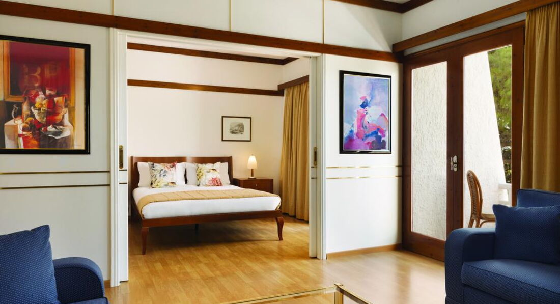 Всього 320 номерів: 140 Superior Bungalows (~26 кв.м), 51 Family Rooms (~36 кв.м), 50 Villas (~30 кв.м), 39 Esperides Villas (~32 кв.м), 7 Esperides Villas Pp (~32 кв.м), 10 Esperides Suites Pp (~56 кв.м), 23 Suites (~50 кв.м). Типи номерів: Residence Garden View (~36 кв.м) Вид на сад розташований в основному будівлі. У ванній кімнаті: джакузі, фен, банний сет, пляжні рушники. Тип додаткового ліжка – диван-софа, максимальне розміщення – до 4-х осіб. Residence Sea View (~36 кв.м) Вид на море, розташовані в основному будівлі. Тип додаткового ліжка – диван-софа. Максимальне розміщення – 4 особи. Superior Βungalows Sea Front (~26 кв.м) Просторі бунгало розташовані біля самого берега моря. Panorama Villas (~30 кв.м) Індивідуальний дизайн, вид на море. Residence Sea Front (~36 кв.м) Розташовані у центральній будівлі, перша лінія від моря. Тип додаткового ліжка – диван-софа. Twin Superior Bungalow Garden View (~26 кв. м) Розташований серед зелених садів. Комфорт та сучасний стиль. Suites - всі сюїти (~40-45-50 кв.м) Suite Main Building Двокімнатна сюїта, спальня та салон, вид на сад, можливе розміщення до 4-х дорослих. Suite Honeymooners Романтична сюїта з чудовим двоспальним ліжком, над яким розташований скляний дах. Suite Panorama Чудовий дизайн, неповторний панорамний вигляд, справжні антикварні меблі. Спальня та салон. Suite Penthouse Двоповерхова сюїта з відкритим басейном та внутрішнім джакузі. Suite Presidential Перегляд моря. Двокімнатна сюїта, спальня з двоспальним ліжком та вітальня, мебльований бар, джакузі, факс. Suite Romantic Вид на сад. Ретро дизайн, спальня з вітальнею відкритий план, 2 великі мебльовані веранди. Suite Superior Двокімнатна сюїта, спальня та салон, дерев'яна підлога, джакузі та душ. Suite Main Building Front Sea Розташовані на 1-му поверсі, прямий вихід на газон, три кімнати, вхід до салону, одна спальня з двома одномісними ліжками та ванною кімнатою, друга спальня з двоспальним ліжком та ванною кімнатою. Suite Garden View Розташовані в центральній будівлі, вид на сад, спальня та салон, дерев'яні підлоги, велика мебльована веранда.У номері: Балкон/тераса Ванна/душ Кондиціонер Міні-бар за доплату Російський канал Супутникове ТВ ТБ Телефон Фен Холодильник
