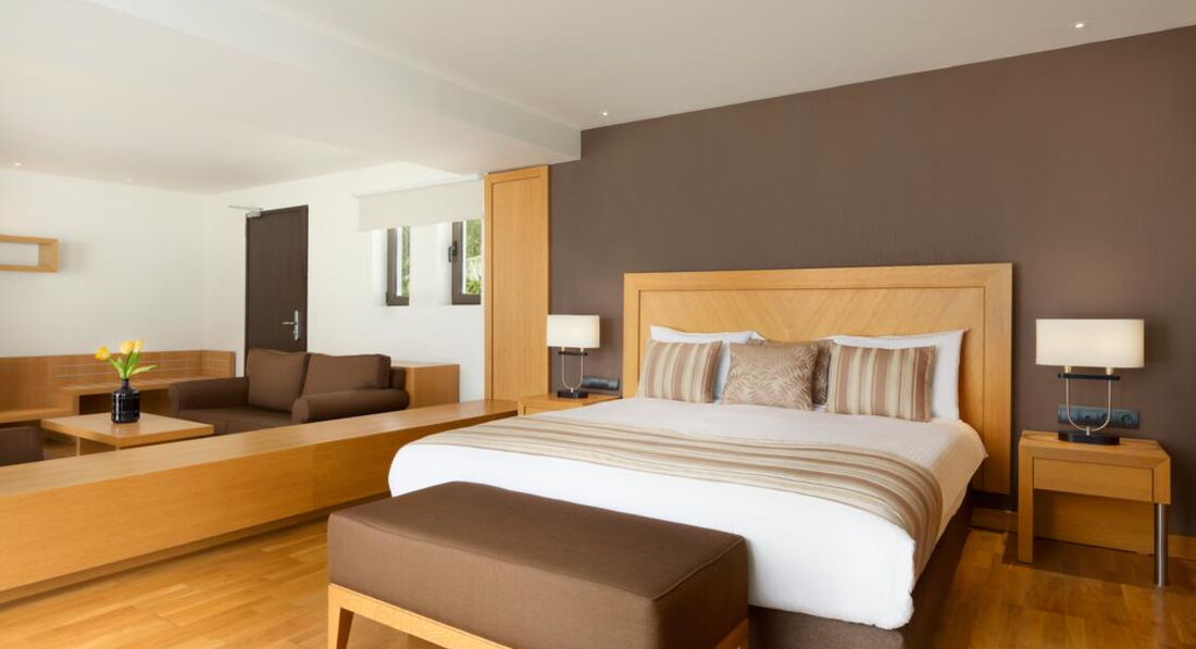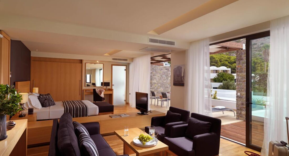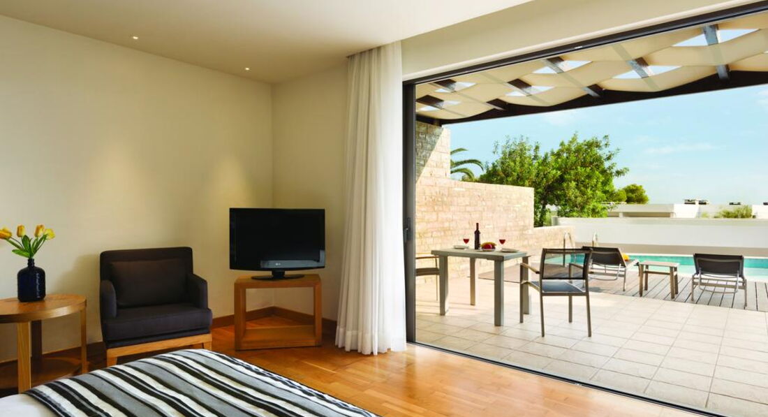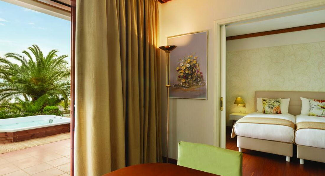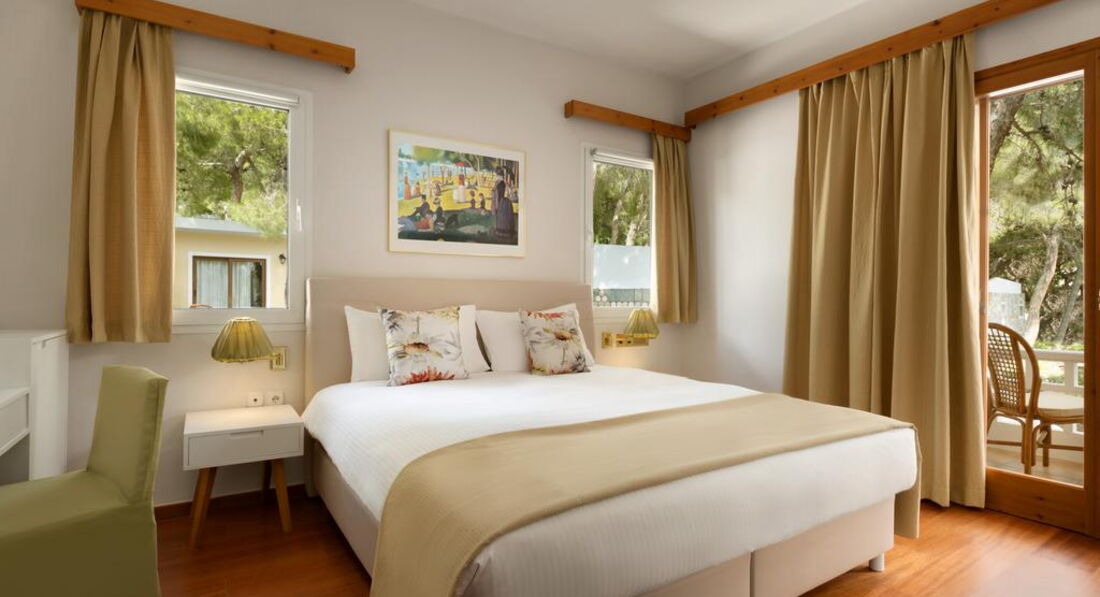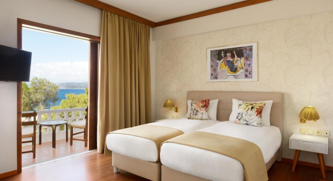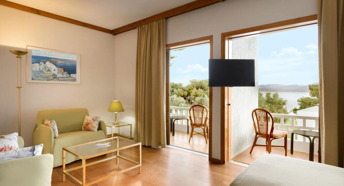 Всього 320 номерів: 140 Superior Bungalows (~26 кв.м), 51 Family Rooms (~36 кв.м), 50 Villas (~30 кв.м), 39 Esperides Villas (~32 кв.м), 7 Esperides Villas Pp (~32 кв.м), 10 Esperides Suites Pp (~56 кв.м), 23 Suites (~50 кв.м). Типи номерів: Residence Garden View (~36 кв.м) Вид на сад розташований в основному будівлі. У ванній кімнаті: джакузі, фен, банний сет, пляжні рушники. Тип додаткового ліжка – диван-софа, максимальне розміщення – до 4-х осіб. Residence Sea View (~36 кв.м) Вид на море, розташовані в основному будівлі. Тип додаткового ліжка – диван-софа. Максимальне розміщення – 4 особи. Superior Βungalows Sea Front (~26 кв.м) Просторі бунгало розташовані біля самого берега моря. Panorama Villas (~30 кв.м) Індивідуальний дизайн, вид на море. Residence Sea Front (~36 кв.м) Розташовані у центральній будівлі, перша лінія від моря. Тип додаткового ліжка – диван-софа. Twin Superior Bungalow Garden View (~26 кв. м) Розташований серед зелених садів. Комфорт та сучасний стиль. Suites - всі сюїти (~40-45-50 кв.м) Suite Main Building Двокімнатна сюїта, спальня та салон, вид на сад, можливе розміщення до 4-х дорослих. Suite Honeymooners Романтична сюїта з чудовим двоспальним ліжком, над яким розташований скляний дах. Suite Panorama Чудовий дизайн, неповторний панорамний вигляд, справжні антикварні меблі. Спальня та салон. Suite Penthouse Двоповерхова сюїта з відкритим басейном та внутрішнім джакузі. Suite Presidential Перегляд моря. Двокімнатна сюїта, спальня з двоспальним ліжком та вітальня, мебльований бар, джакузі, факс. Suite Romantic Вид на сад. Ретро дизайн, спальня з вітальнею відкритий план, 2 великі мебльовані веранди. Suite Superior Двокімнатна сюїта, спальня та салон, дерев'яна підлога, джакузі та душ. Suite Main Building Front Sea Розташовані на 1-му поверсі, прямий вихід на газон, три кімнати, вхід до салону, одна спальня з двома одномісними ліжками та ванною кімнатою, друга спальня з двоспальним ліжком та ванною кімнатою. Suite Garden View Розташовані в центральній будівлі, вид на сад, спальня та салон, дерев'яні підлоги, велика мебльована веранда.У номері: Балкон/тераса Ванна/душ Кондиціонер Міні-бар за доплату Російський канал Супутникове ТВ ТБ Телефон Фен Холодильник