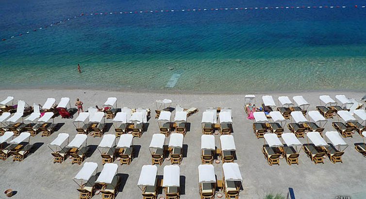 Пляж : власний, піщаний, пірс, понтон, протяжність 105 м, кабінки для перевдягання, душ; пляжні рушники, парасольки, шезлонги на пляжі та біля басейну – безкоштовно.