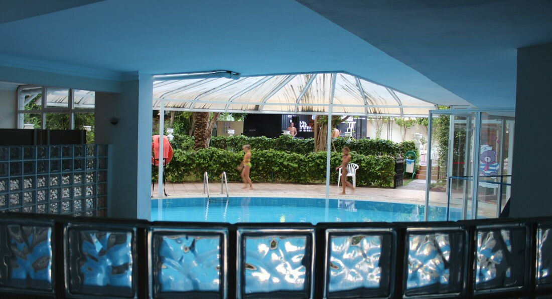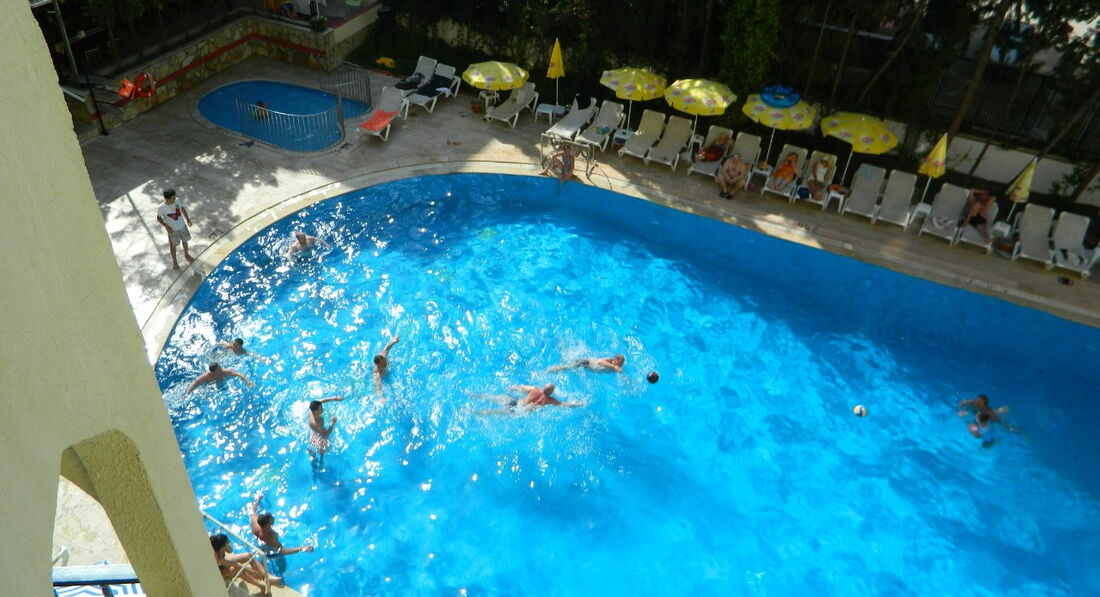2 бассейна (1,42м и 2,8м ) кристально чистые, всегда свободны. На деской горке катались и взрослые иногда. Их не выгоняли. Детей не ущемляли. Большой бассейн не успеает прогреться, т.к. солнце его освещает только после обеда. Вода в маленьком бассейне как парное молоко. Отельная анимация хороша, Аниматоры супер, но мало ревизита у аниматоров. Вечером возят на дискотеку в Аланью за 10$, иногда бесплатно.