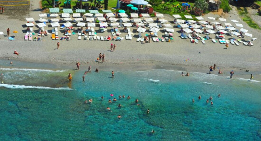 Пляж близко, лежаки удобные, можно взять матрас (склад за туалетом). Душ на пляже открытый. Бар безалкогольный. На пляже пекут лепешки - гёзлеме. Вкусные. Море теплое, очень соленое. Вода чистая, камушки приятные, хорошо шелушат пяточки. Минус в том, что плиты, при сильном волнении моря можно травмироваться.