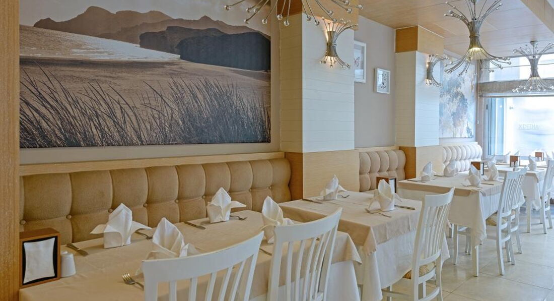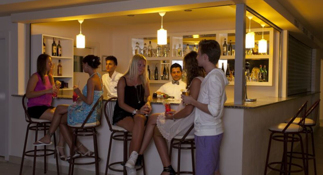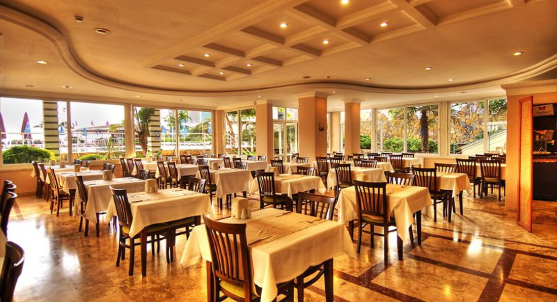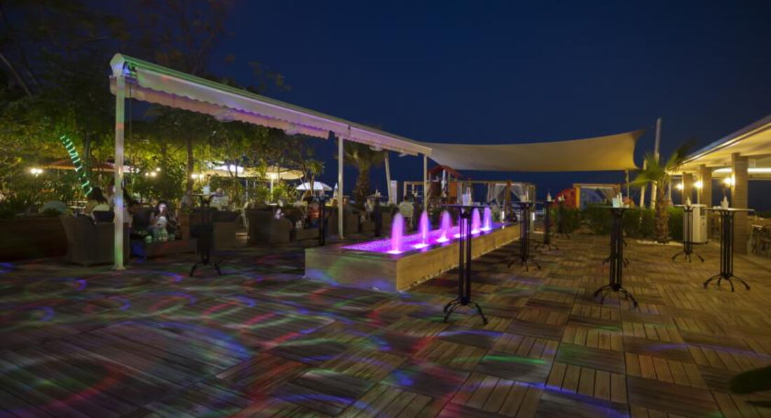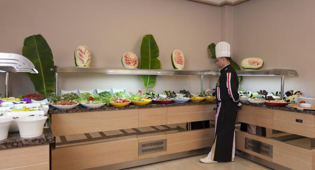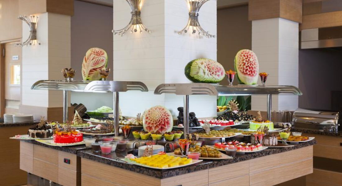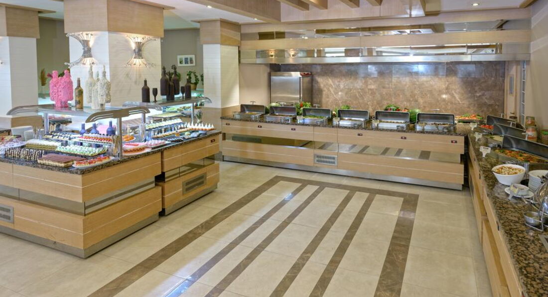 Бари та ресторани: Сніданок з 08:00-10:00, пізній сніданок з 10:00-10:30 (за меню), обід з 12:30-14:00, чаювання з 10:00-18:00, вечеря з 19:00-21:00, пізня вечеря (суп) з 23:00-00:00. Ресторан вміщує 200 осіб усередині та 200 осіб зовні. Зразкове дитяче меню: паста, картопля, кукурудзяні пластівці, спагетті, супи, яйця, молоко, сир, йогурт, какао, солодощі. Ресторан на пляжі: з 10:00-18:00, пропонуються міжнародні страви, закуски. Big Horn: з 10:00-02:00, пропонуються страви міжнародної кухні. Бар у ресторані. Бар на пляжі. Бар біля басейну. Бар у лобі. X Cafe. Снек-бар.