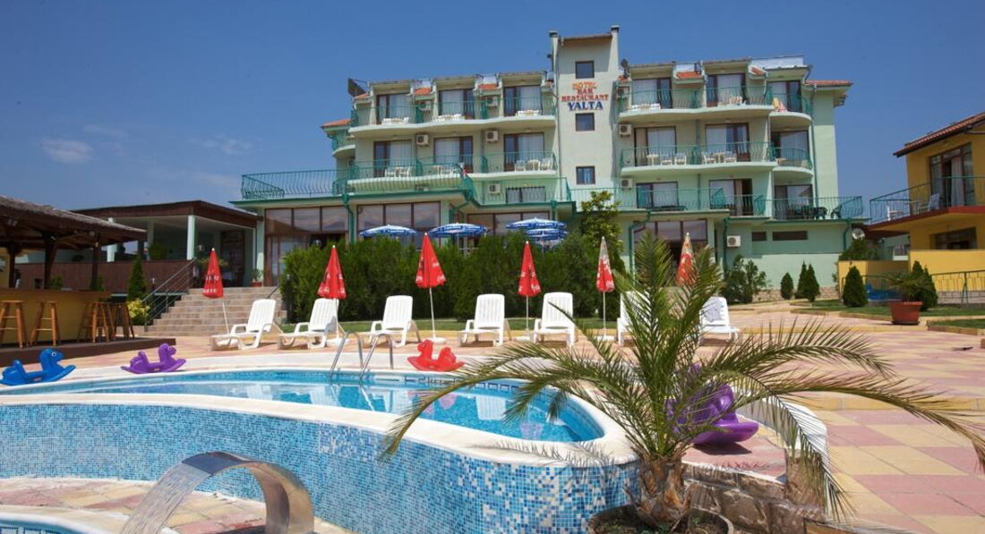 2 недели,проведеннные в отеле Ялта пролетели быстро.Прекрасная погода,душевный обслуживающий персонал,говорящий по-русски во главе с хозяйкой Любой сгладили некоторые недостатки в этом отеле. Отель находится в прекрасном месте(рядом город Св.Влас-20 мин пешком или на автобусе-5 мин).Пляж немного дикий,но благоустраивается. Рядом с отелем зеленая зона.,2 бассейна(с детским),живая музыка,ресторан,магазин и прочее... Обслуживание на высоком уровне.Несколько однообразная еда,особенно утром.Своим номером я осталась довольна.Всегда чисто убирался ежедневно,2 раза в неделю менялось постельное белье.Неудобно в номере распололожена душевая(но это прететезии к проектировщикам). С 3 этажа с балкона потрясающий вид на море,внизу-на бассейн и на очень опрятный внутрений дворик с шезлонгами и зонтами около бассейна(когда очень жарко-приятно искупаться в бассейне и полежать в тени).Все это создает-семейную идиллию.Отель хорош и для спокойного отдыха и для семейного с детьми. Из-за сильного ветра иногда "пропадали"некоторые каналы по ТВ .К недостаткам отношу высокую стоимость маленького сейфа в номере(3 евро в день).Советую,кто еще не побывал в Болгарии,посетить ее и прекрасный ее уголок в лице отеля Yalta 3***.Приятного отдыха всем.Спасибо за работу моим новым знакомым Любе,Катюше,Петеру,Лыке и всем остальным,которые своим дружелюбием оставляют о Болгарии чудесные воспоминания. Надежда из Риги.