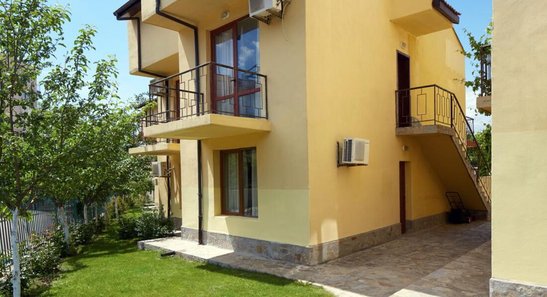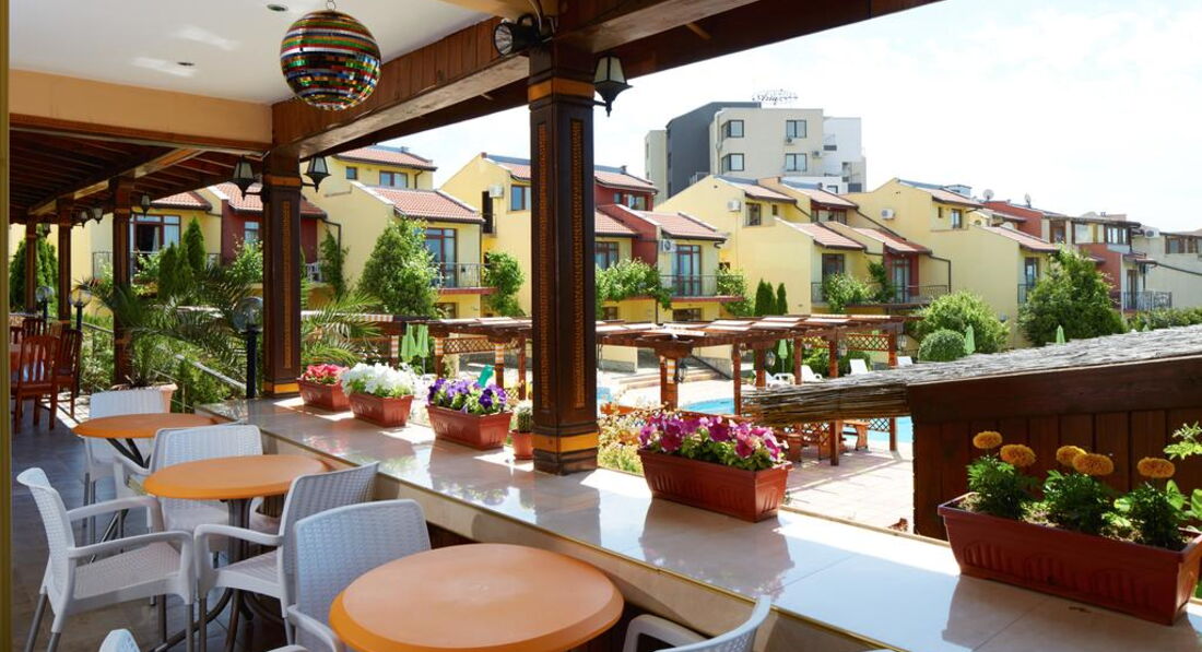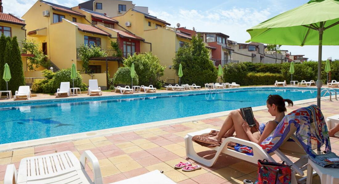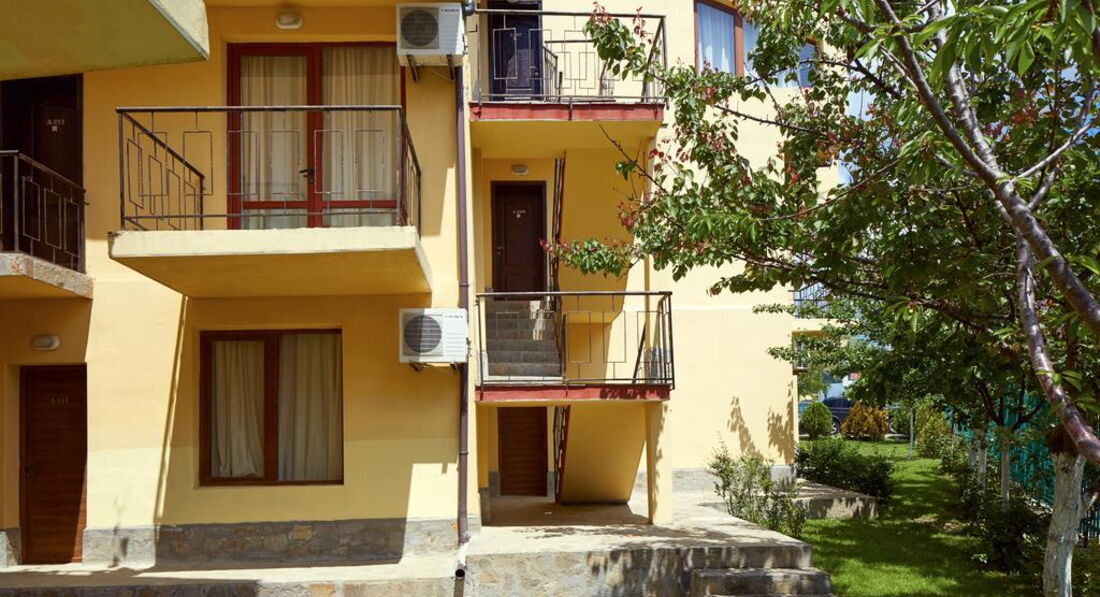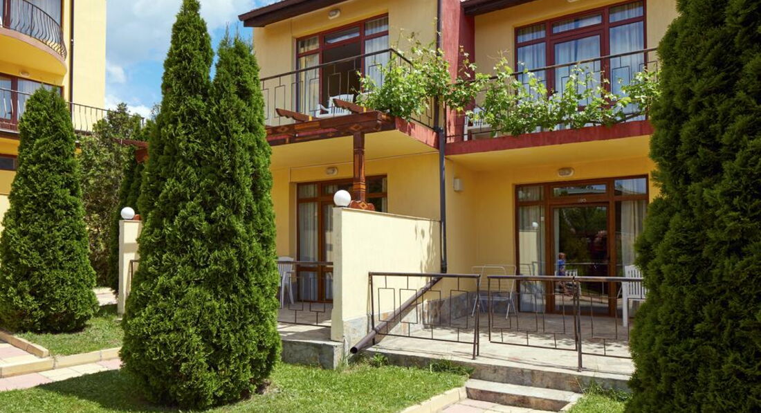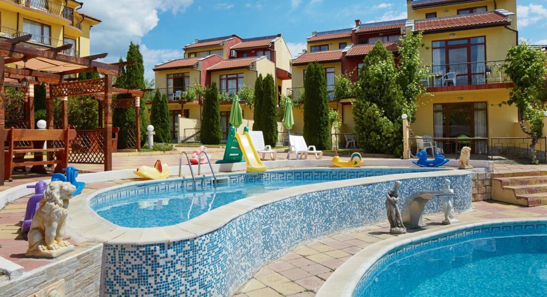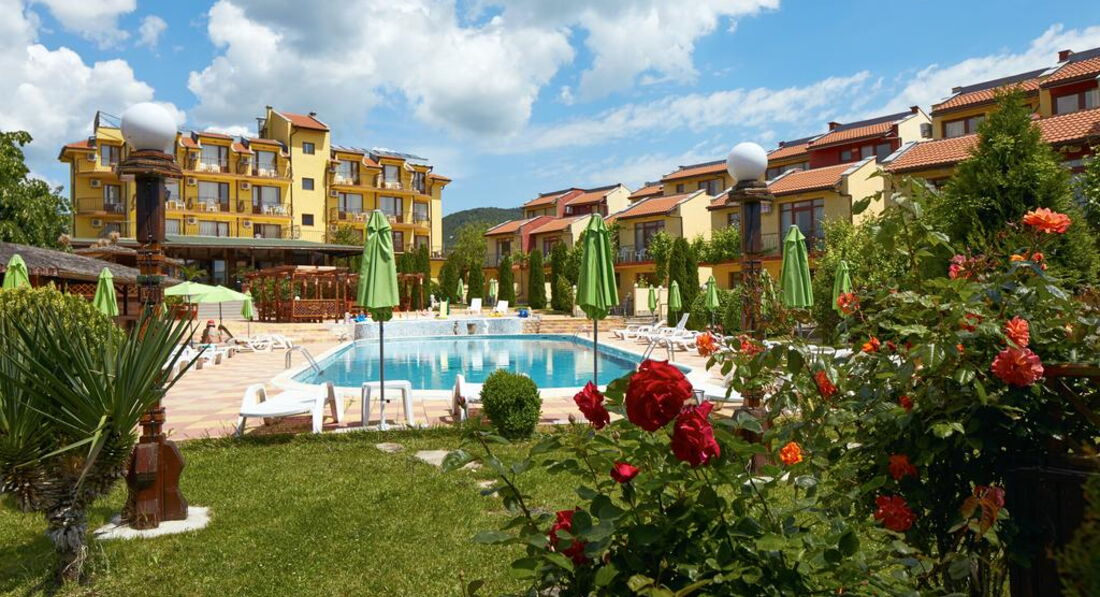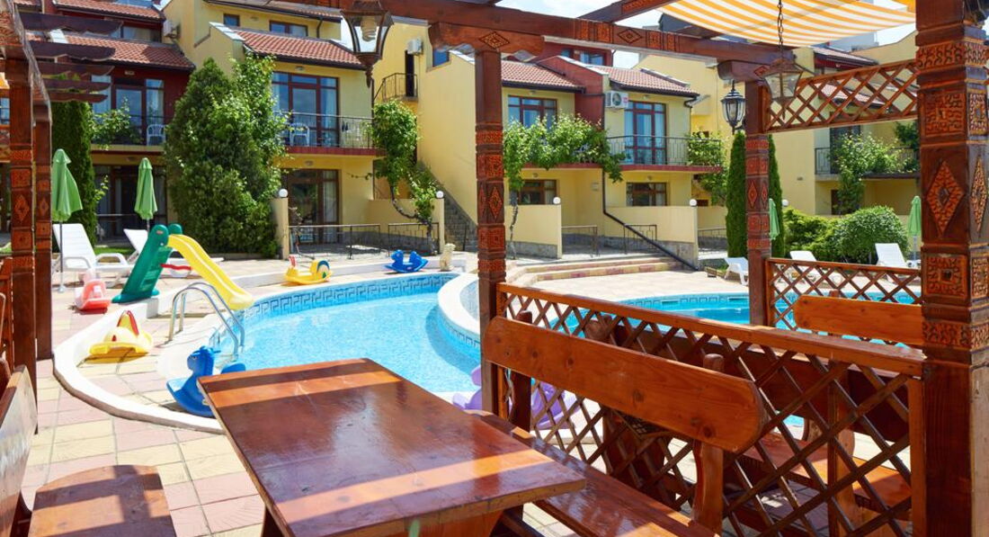 Добрый день! Отдыхали с семьей 5 взрослых и 2 детей в августе 2016 года. Прилетели вечером в 23.00 ч. Разместили сразу , нам как я и хотела, достался номер ( 2 взрослых и 2 детей) с выходом на бассейн на 1 этаже. Принесли детскую кроватку, но вместо матрасика большое одеяло, но мы его свернули и было нормально. Нам на все время дали коляску. Номер студия с кухней и раковиной и маленьким холодильником, нам было удобно(плиты нет). Завтраки нормальные овощная нарезка, колбасная и сырная, салат из капусты. Яйца вареные, овощи тушенные, спагетти отварные,картошка отварная и сосиски. Апельсины, яблоки, арбузы, сливы. Мюсли и добавки к ним, каши через день рисовая или манная. Убирались каждый день. На территории есть магазин где можно купить все необходимое. Бассейн большой и что радовало всегда свободный, шезлонгов хватала всем. Персонал в основном русскоговорящий. Отличный администратор Инесса приветливая, отзывчивая, веселая. Все что нужно можно взять у нее утюг, фен, посуду в ресторане. Территория ухоженная засаженная розами и фруктовыми деревьями. Единственное что мало развлечений для самых маленьких ( 1 горка и несколько качалок). Детский бассейн небольшой, но теплый. Нам все понравилось, минусов мы не искали, пыль по углам тоже, ко всему относились позитивно. Рядом есть большой супермаркет Меркурий, там покупали детское питание для малыша, кстати очень вкусное. В отеле отдыхаем очень много семей с детьми от 1 до 12 и тд. вечером в ресторане поет девушка, но после 23.00 абсолютная тишина. отель семейный для очень спокойного отдыха. Отдохнули хорошо, Болгария прекрасна. Обязательно вернемся еще раз.