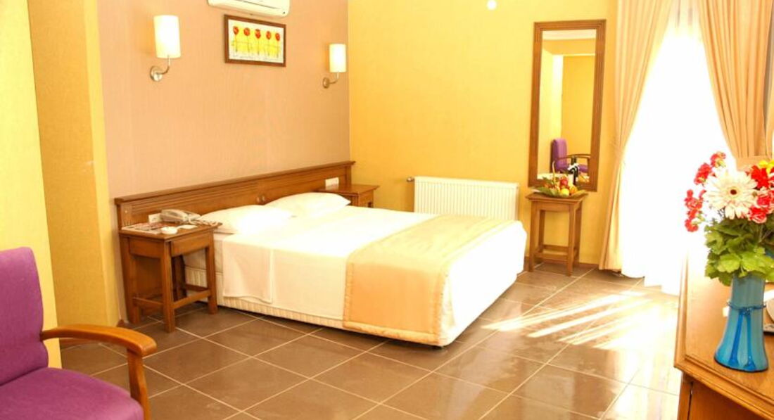 Отель на обещанные 4* не дотягивает. Нет многого того, что есть в описании отеля. Начну с расселения. В отель мы попали поздно вечером около 23 часом . Нам предложили номер, который выходит на улицу баров в левом крыле отеля, кода мы отказались нам предложили доплатить 210 долларов за семейный двухкомнатный номер, сославшись на то, что других номеров нет. Мы, чтобы не портить себе отдых согласились и вобщем не пожалели. У ребёнка была своя комната а унас с женой своя. Убирали в номере отвратительно. Полы из коврового покрытия по-моему ниразу не пылесосили, часто не хватало чистых полотенец и тогда они меняли только те на которые у них была замена. Чтобы поменяли постельное бельё нужно было обращаться на рецепшен. Жидкое мыло и гель для душа тоже пополнялись только после обращения на рецепшен. Но привсём при этом персонал очень приветливый и отзывчивый. Пляж грязноватый и убирали его за две недели по-моему только один раз да и то просто прошлись по нему граблями. Представители Pegasa появлялись редко их интересует только покупка экскурсионных туров, которые стоят у них почти в 1,5-2 раза дороже чем в уличных агенствах. Развлечений в отеле нет никаких за исключением так называемой турецкой ночи когда выносят торт из мороженного и потом исполняются танец живота и несколько национальных танцев. турецкие ночи бывают по средам. По субботам на площади недалеко от отеля базар овощной и текстильный много фруктов очень вкусные. на текстильном базаре тоже можно кое-что купить цены приемлимые. Кроме этого в посёлке очень много разных магазнов и магазинчикв начиная от крупных супермаркетов таких как Мигрос и тансос и кончая маленькими магазинчиками на любой вкус! Но отдых естьотдых море воздух природа великолепные и если не обращать внимание на мелочи то отдых получится хорошим.