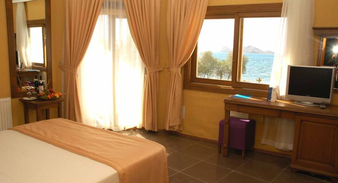 Отзыв мой запоздалый,но лучше поздно,чем никогда.Надеюсь,кому нибудь пригодится.Отдыхали в отеле с 01.09.2012 по 07.09.2012. Мало,потому что 1,5 дня потеряли(В последний день забрали из отеля в 07.00)Хорошо,что приехали в начале сентября.В Бодруме сезон раньше заканчивается,чем на Средиземном.Последние 2 дня купались в бассейне,так как с моря дул сильный ветер.Отель сразу понравился,очень милый,красивая территория,ухоженная,хоть и не большая,зато все под боком.Для нас это было очень важно,т.к мама после операции не могла далеко ходить.Приехали в отель в 13.00,пообедали,заселили в 15.00,пришлось подождать,зато номер дали как раз для нас,все рядом и море в 2 шагах.Немного шокированы были тем,что в отеле никто не говорит по русски,даже на ресепшене(отдыхают в основном иностранцы,и как мы поняли-это большой плюс!Очень воспитанные люди,ни пьянок,ни шума.)Вообще,в отеле очень спокойная,приятная атмосфера.Днем анимации не было(кроме аква-аэробики),вечером небольшие концерты устраивали.Море_сказка!Заход отличный,на любой вкус.Лежаков всегда хватало,т.к. иностранцы предпочитают бассейн(у бассейна, кстати, тоже места были).Питание для 4*хорошее,даже получше некоторых 5* будет.Всегда было мясо,курица(крылышки!),рыба,много овощей,сладостей(очень вкусные тортики!).Фрукты-апельсины(не резаные),виноград,яблоки,сливы,,арбузы и самые вкусные персики!После ужина давали мороженое(вкусняшка!).Убирались регулярно,полотенца меняли ежедневно.Персонал услужливый,не навязчивый.Понравилась прогулка на яхте.Вообщем,что хотели,то и получили.А хотели моря,солнца и спокойного отдыха!Вернулись бы с удовольствием,но только в июле,августе.