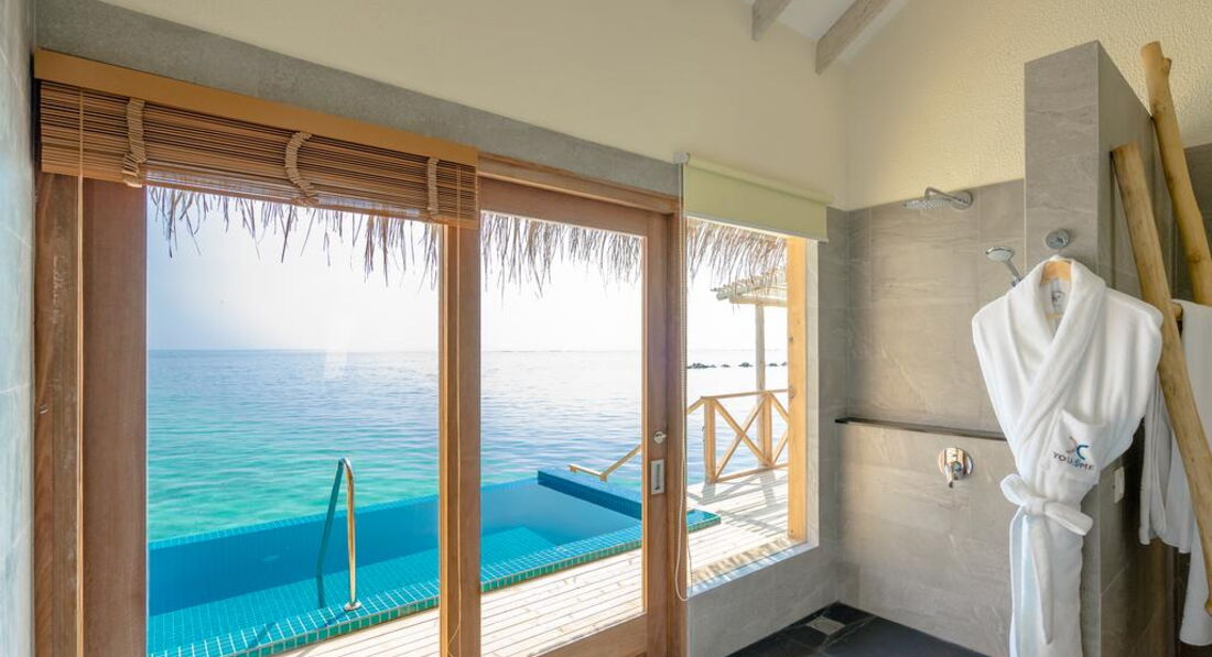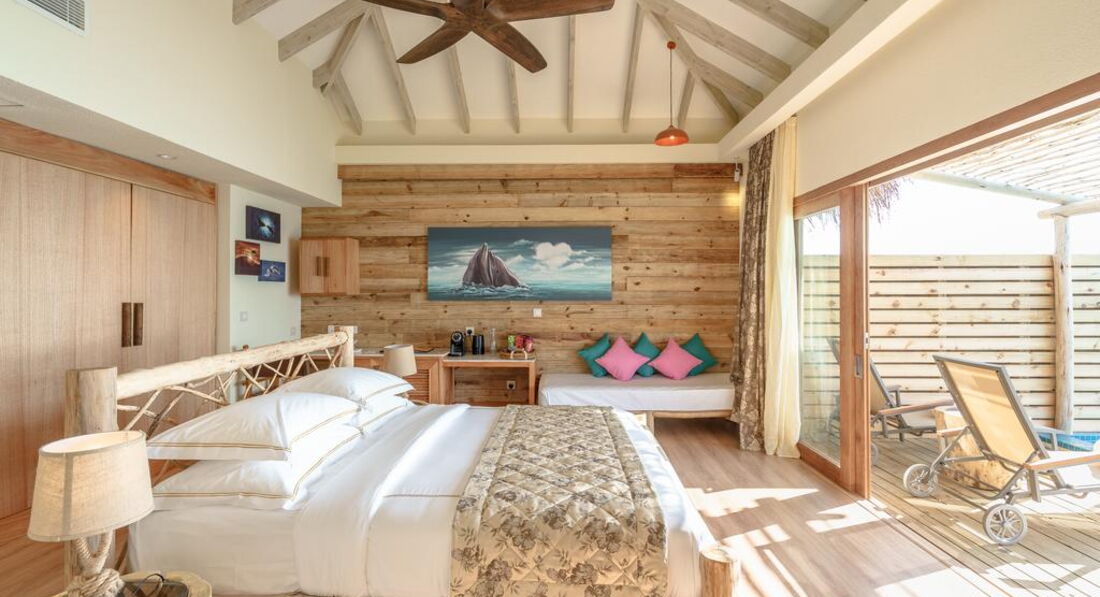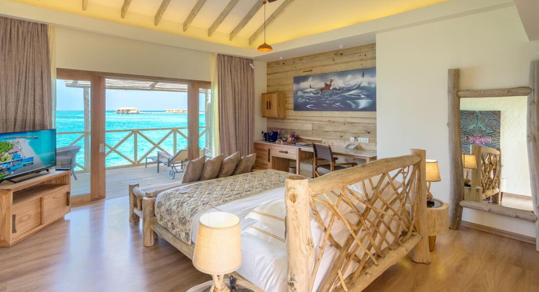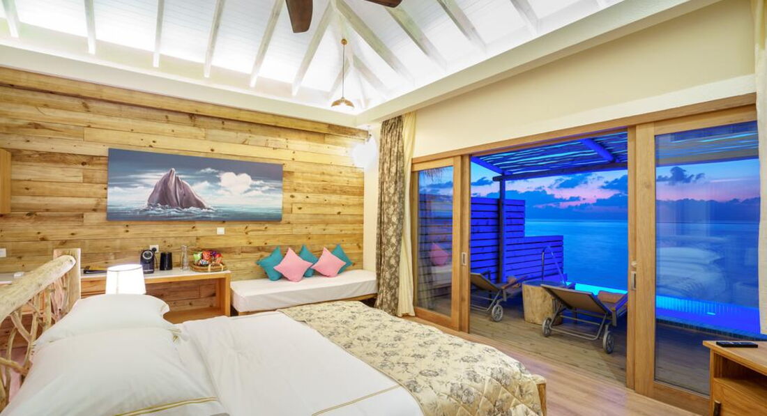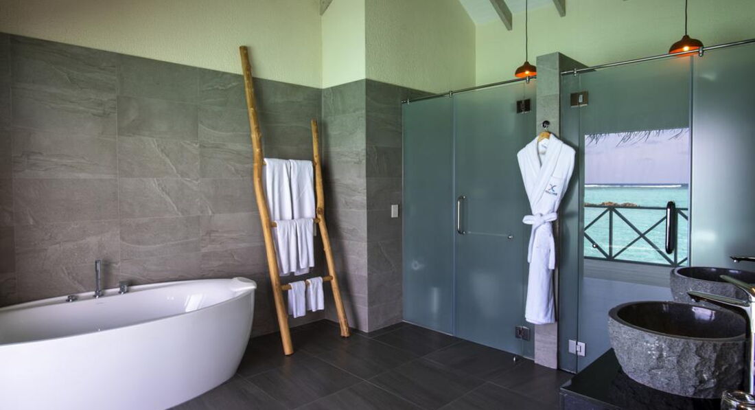 • AQUA SUITE 65 кв.м., вілла розташована на лагуні, двоспальне ліжко з видом на океан, ванна кімната з душовою кабіною та ванною для двох, вид на схід сонця