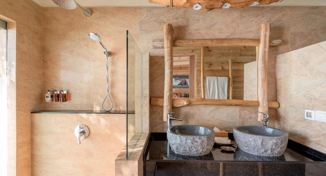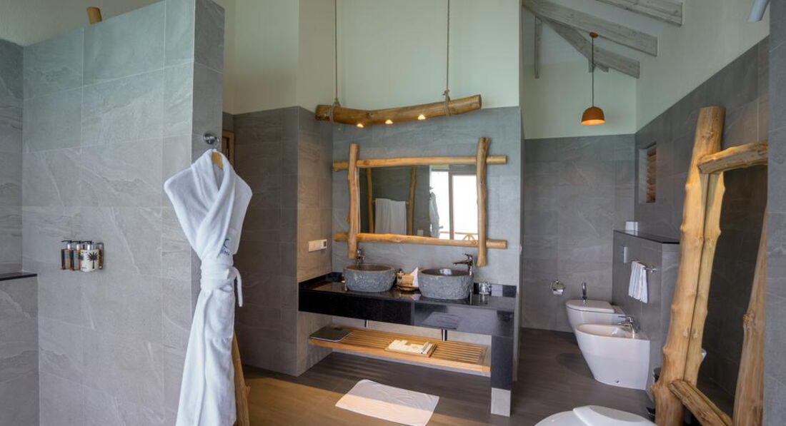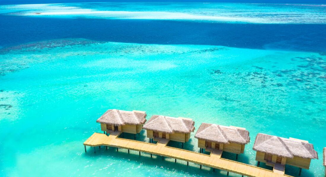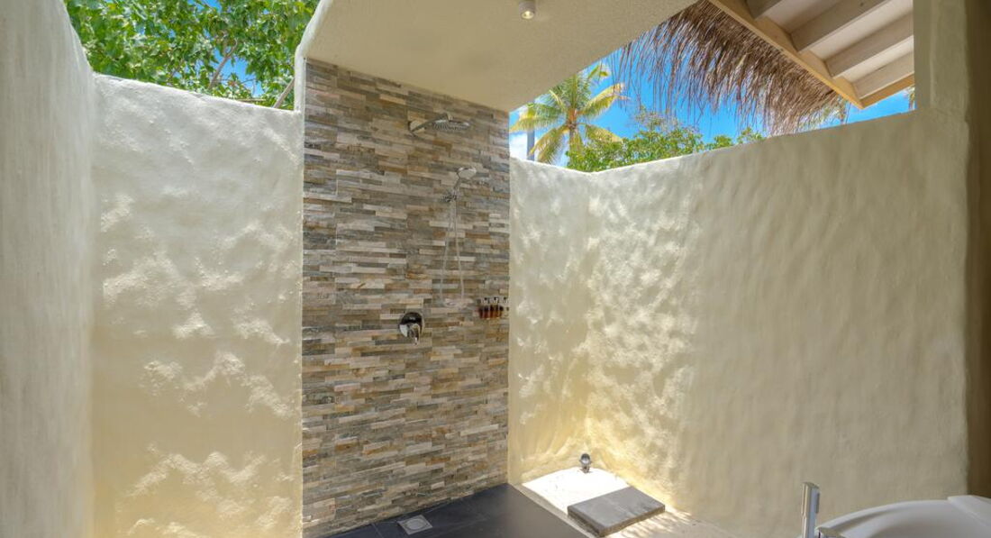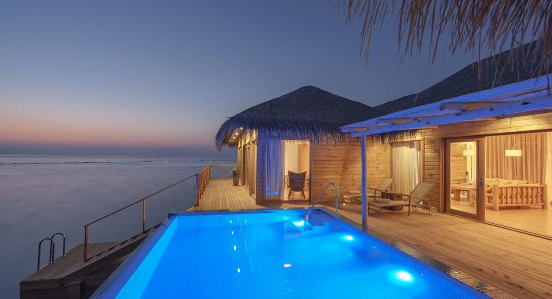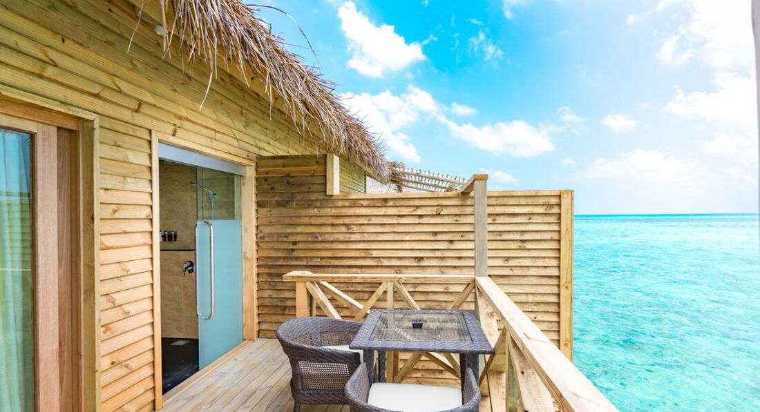 • AQUA SUITE 65 кв.м., вілла розташована на лагуні, двоспальне ліжко з видом на океан, ванна кімната з душовою кабіною та ванною для двох, вид на схід сонця