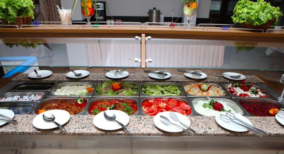 80% блюд повторяются каждый день, немного надоедает. Первое не пробовал. На второе подают курицу(почти каждый день), картофель запеченый или "фри", колбаски, лапшу, рис, пару раз был пюре даже, салат, огурцы, помидоры, капуста. Морепродуктов не было вообще! Из сладостей- иногда пирожные, но и то тем, кто приходил позже, уже не доставалось. Из фруктов- сливы, персики и пару раз арбуз и дыню давали. История такая же как и со сладостями, многим не доставалось.