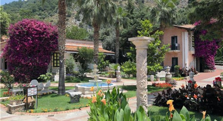 Территория отеля достаточно большая, сам отель выполнен в эклектическом направлении (смешение нескольких стилей). Очень уютный, много каменных скульптур, переносящих нас а античность и прошлые века, скамеечек, фонтанчиков, колонн, наряду с ними - уютные деревянные качели, каменная кладка в старинном стиле и современные кипельно-белые отштукатуренные стены домиков-коттеджей (3-х этажных) с синими фрагментами (окна, двери, элементы декора на балкончиках). Много дорожек, ступенек, полно урн, много цветущий растений и вообще зелени. Место ухоженное, ярусное (отель располагается в горах), прекрасная вечерняя подсветка (более подробно территорию отеля можно увидеть в подборке ниже). Экзотические насекомые не досаждали. Иногда на обед прилетали пчелы и осы, чтобы украсть у вас с тарелки кусочек мяска или натуральной колбаски. Комары не встретились, хотя некоторые гости отеля говорили, что они там есть и пользовались «фумитоксами».