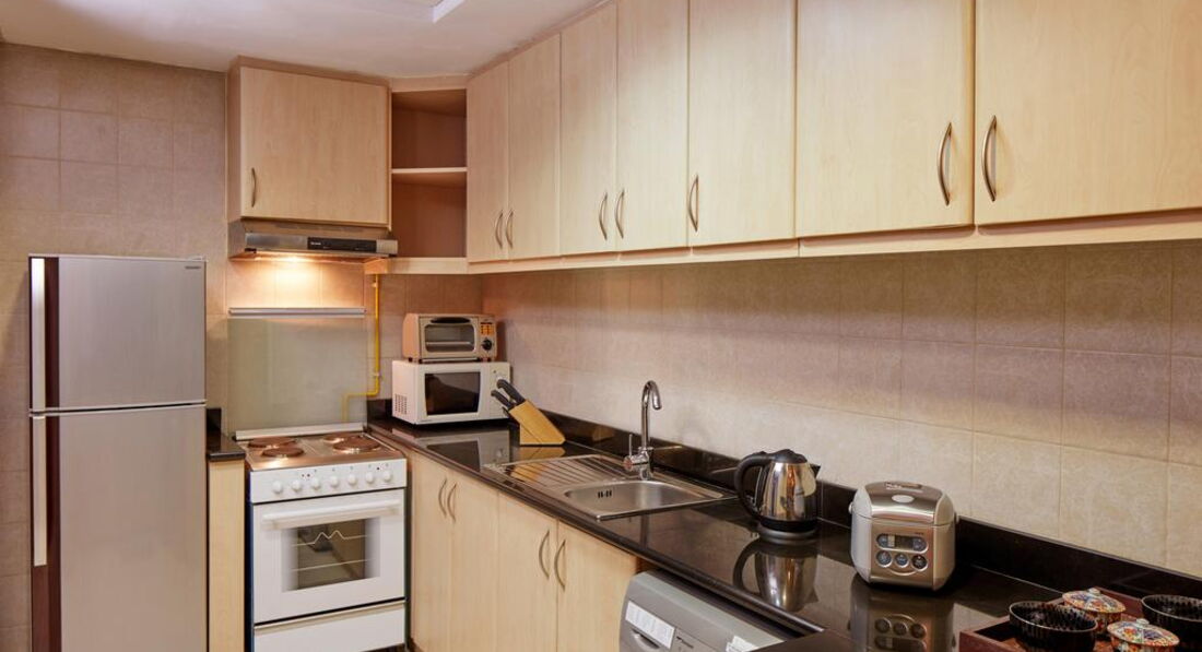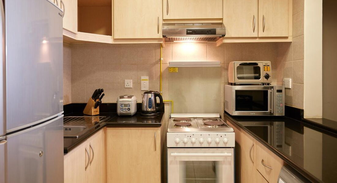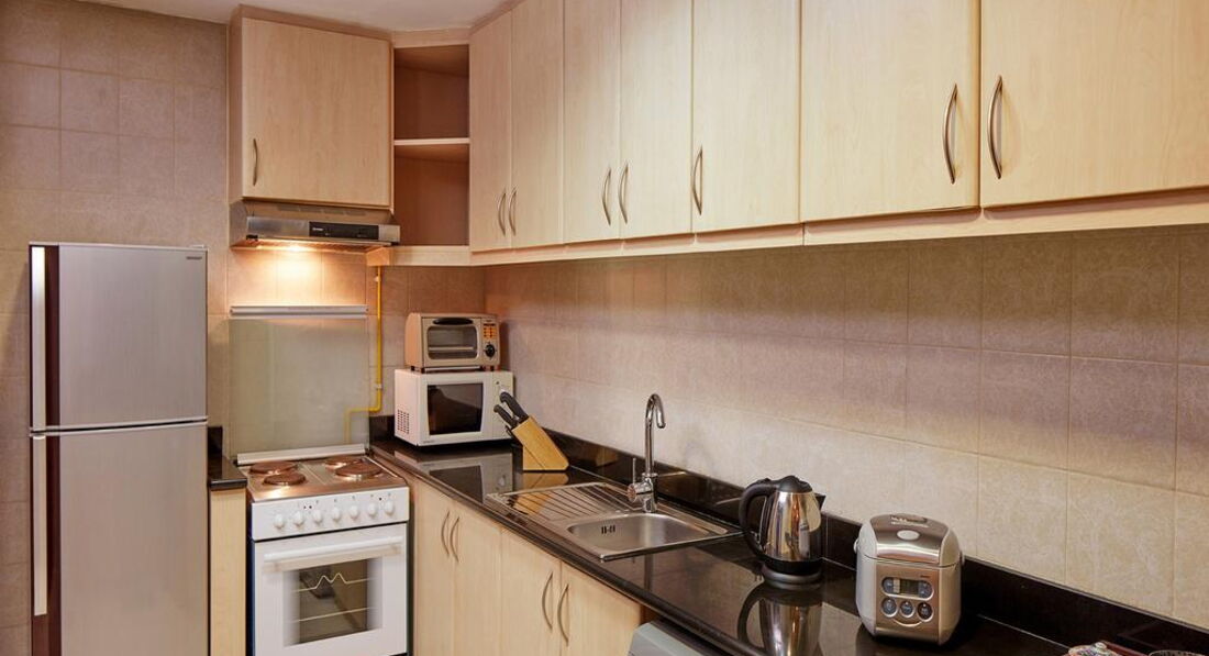 • кухня (обідній стіл, плита з духовкою, кухонне начиння, електричний чайник, мікрохвильова піч, тостер)