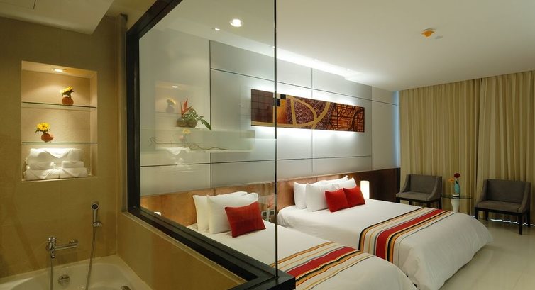 Номера, по сравнению с другими отелями паттайи, просто отличные, все чисто, ново и креативно. В номере в осном корпусе: кондиционер, мини-бар в маленьком холодильнике, сейф, халаты, тапки, набор для чая, фен, туалетные принадлежность, в стандартном номере друхспальная кровать и односпальная. Уборка каждый день, полотенца меняли утром, и по желанию еще и вечером. Номер метров 20 и большая ванная комната: в ней ванна, душевая кабина, столешница с раковиной. Ванная комната представляет собой отгороженную стеклянными стенами часть комнаты. Именно стеклянными - это очень оригинально :)) Есть возможность закрыть стены шторами.