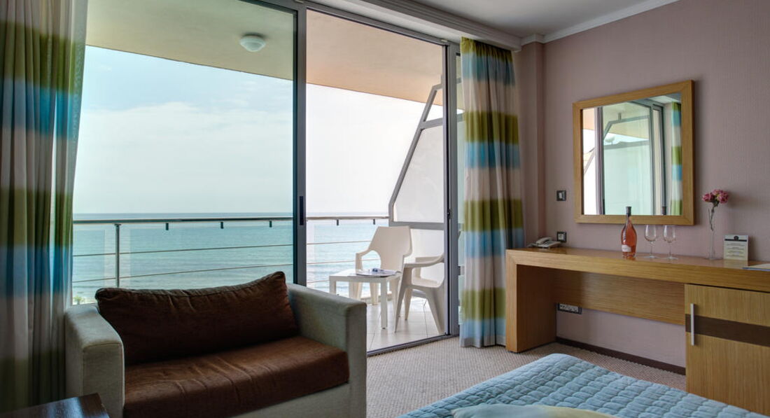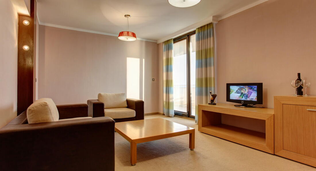 Suite Partial Sea View – частковий вид на море, спальня з двоспальним ліжком та вітальня з двома кріслами та розкладним диваном, міжкімнатні двері, макс. 3 дор. + 1 дит., 60 м2;